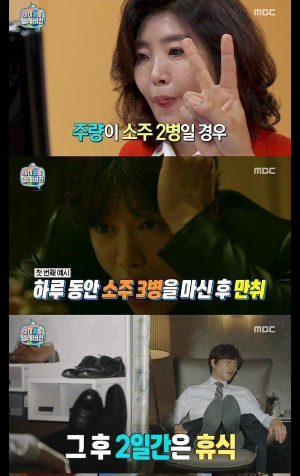 주량이 소주 2병인 사람이 하루만에 소주 3병늘 마시고 만취 후 2일 휴식한 케이스.