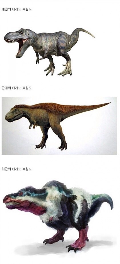 그나마 최근 복원된 티라노사우르스의 모습을 보면, 깃털이 온 몸을 뒤덮은게 아닌 뒤통수부터 목덜미 쪽에만 털이 살짝 나있는 모습을 보기도 하는데요.