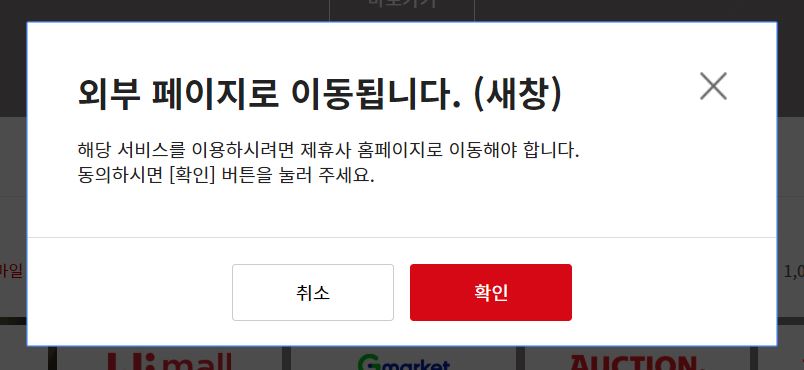 '샵앤마일즈' 에서 쇼핑하고자 하는 온라인 몰을 골라 클릭하면 위와 같은 팝업이 뜨고, '확인'을 누르면 샵앤마일즈를 경유한 쇼핑몰로 이동한다.