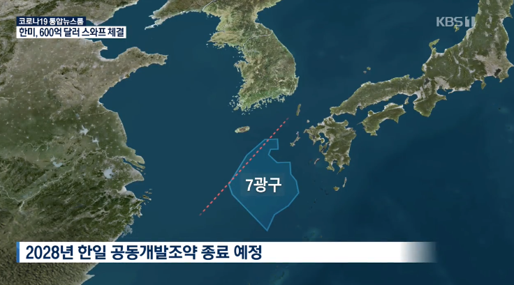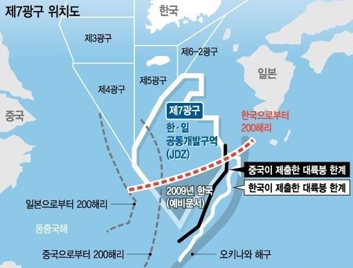 위치 상으로는 일본에 근접하나, 1958년 공표된 제네바 해양법에 의해 국토와 대륙붕이 자연적으로 연결되는 경우 당 국가의 영유로 인정한다는 조항 덕에 한국과 이어지는 대륙붕에 있는 제 7광구에 대한 영유권을 주장할 수 있었던 것입니다.