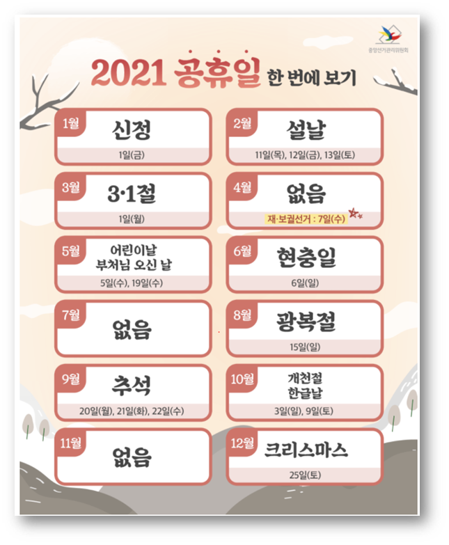 - 대상 : 선거로인한 휴일을 제외한 모든 공휴일